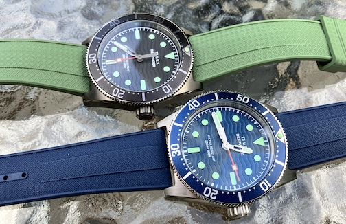 I’m going to classify these as modern skin divers, as tool watches. They are solid water watches lacking the finer details. After all my thinking about it, maybe these are supposed to be working watches, not desk divers? Still, I’m not sure they will attract people looking for a serious dive watch. They are unique and done as only Timex can. I think its a winning design with the whole being greater than you would expect from the individual parts.