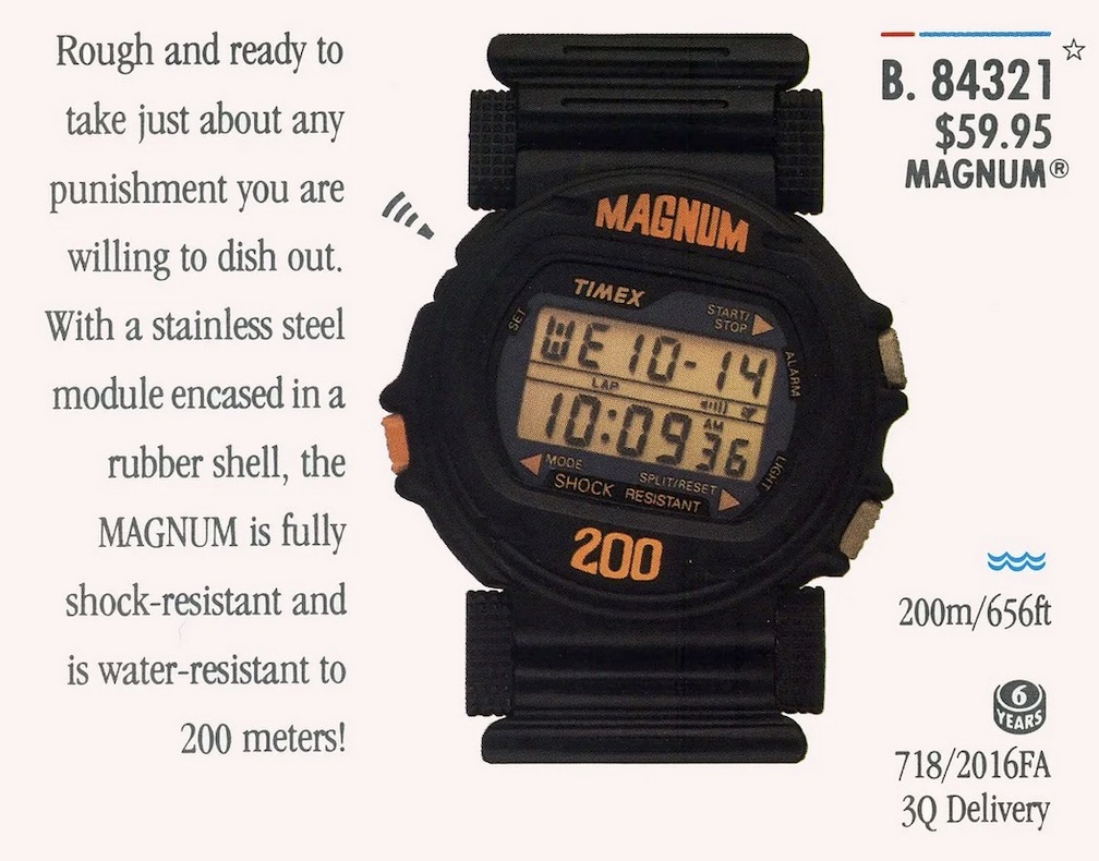 The above Magnum is interesting in that Timex never called it a diver or diver-style even though it was their only 200m watch? The 90s were the peak of Triathlon participation and Timex had a huge line up of Triathlon and Ironman watches. Timex watches probably were suffering from a lack of ruggedness so the Magnum was probably brought int to cover that heavy-duty ground? Later, by ’95 the Ironman was incorporating more durabilty.