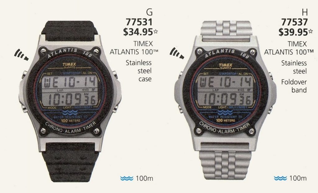 The Atlantis 77531 100m above actually goes all the way back to 1985 as a Marathon 77551. Starting in 1987 the name Atlantis appears. I’m not sure the difference, but probably had to do with electronic components. The overall build was the same. They were not called Diver-style in 1985. The name Atlantis surely contrives to evoke the watery world?