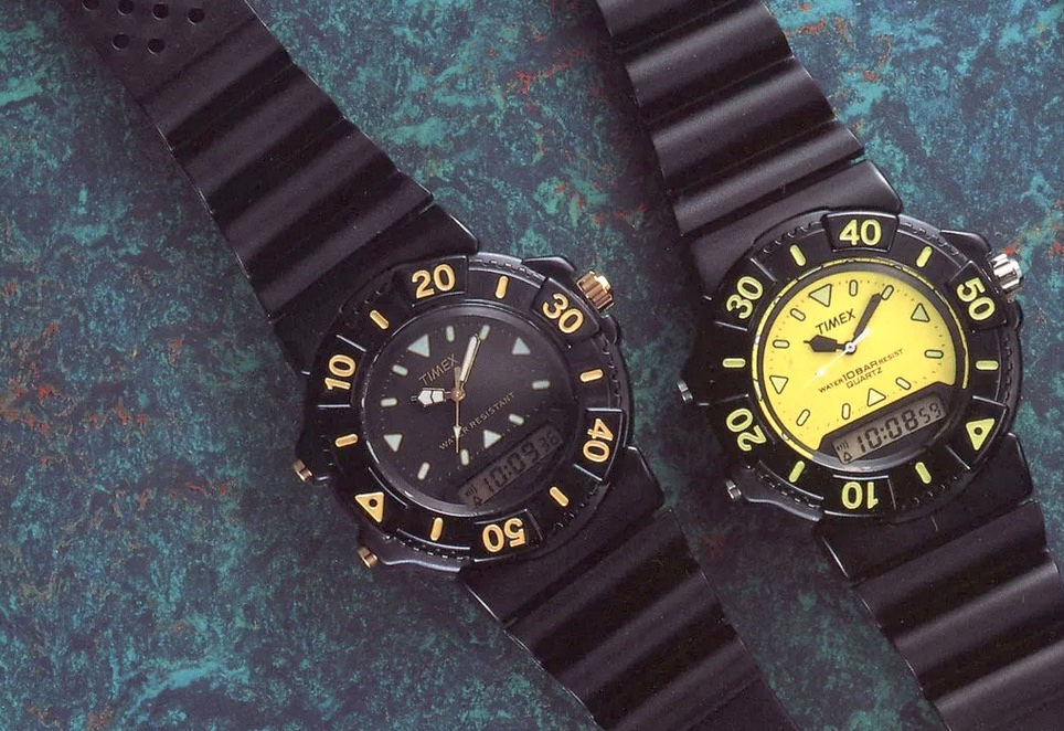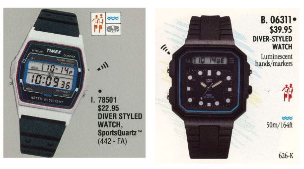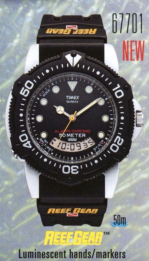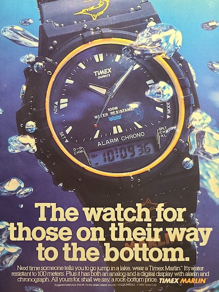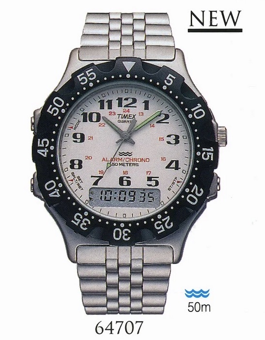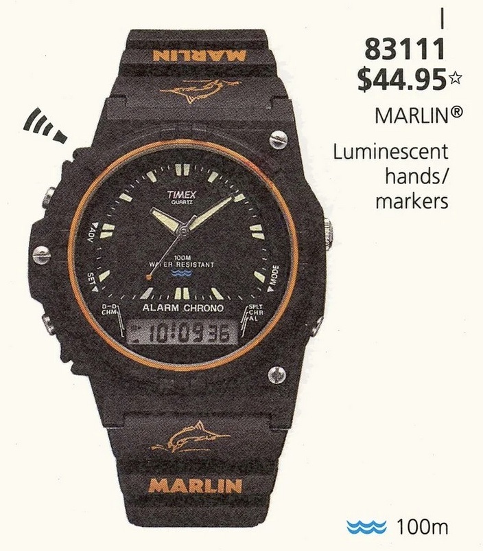 The Marlin analog-digital is an interesting watch to look a too. Having been in the lineup from 1989 to at least 1995, it takes the famous Timex name and even used the fish logo for a few years. I believe it was the first 100m ana-digi? It was never marketed as a dive-style. It has a very angular, asymmetrical, techy feel, somewhere between the Ironman and the Atlantis lines. Below is an ad from 1989 when launched.