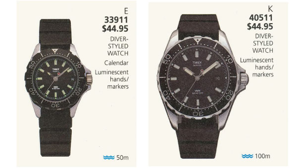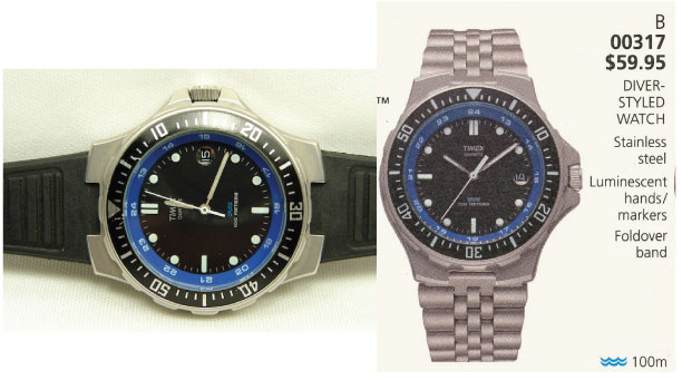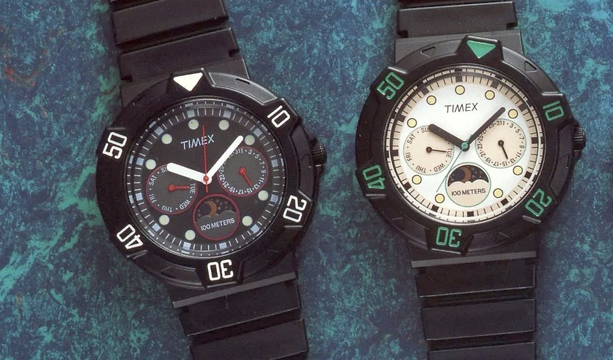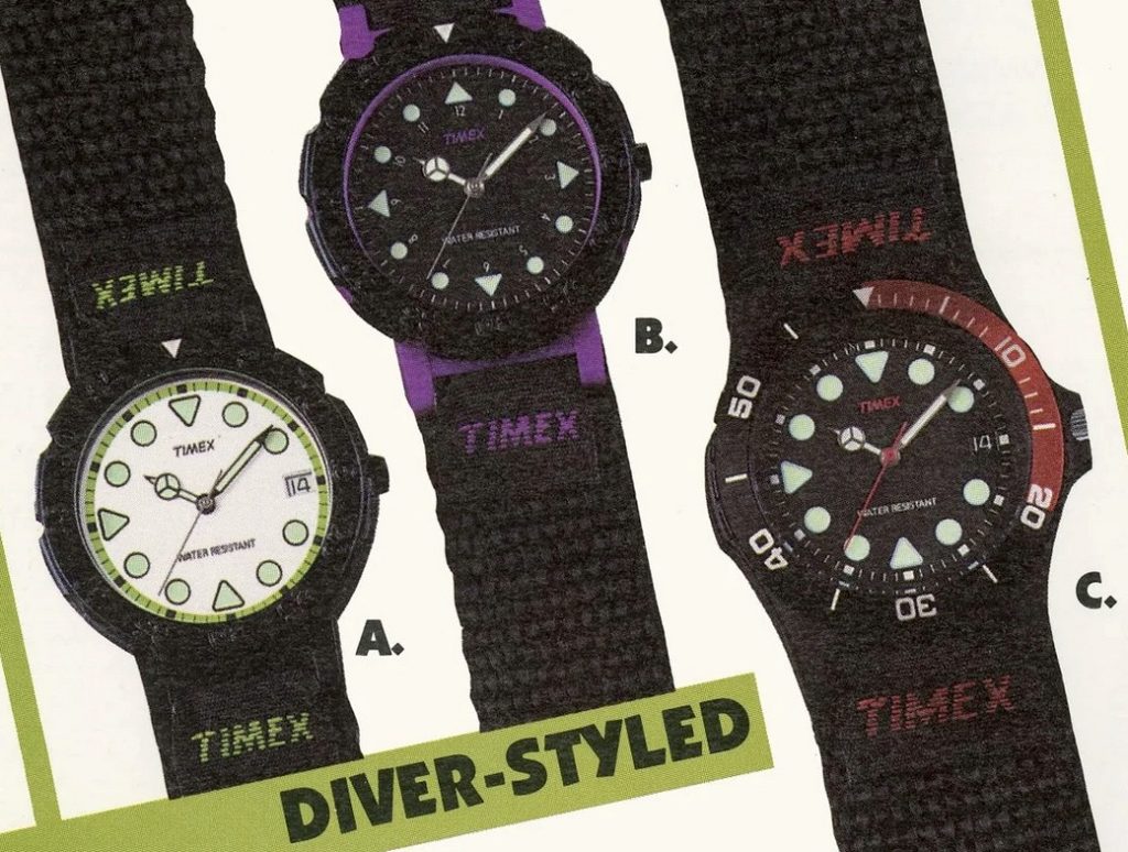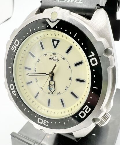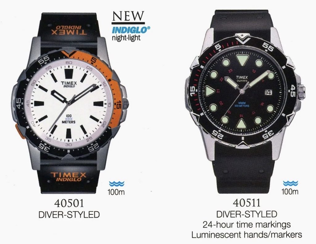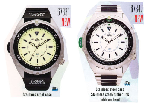 Below is an interesting development in the Timex 100m Diver group that came about in 1994. Indiglo was introduced to a more traditional diver look.
