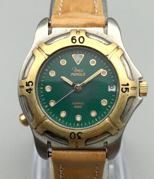 The above green-dialed 22922, women’s watch released in ’95 is one I wanted to point out. It could use a cleaning, but, I really like this look. The green sunburst dial, hour markers and gold bezel are great. Also notice the cursive Timex word mark. No men’s equivalent was made. If this was a little bigger, say 34mm, and had a bit more bezel detailing, like the women’s 54912 mentioned earlier, I’d be tempted to throw this on a NATO of some kind. I will wear a small watch. (I have a late ’40s-ealry ’50s DeFrece mechanical at only 29mm that I wear on a 16mmm canvas Haveston single-pass).