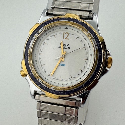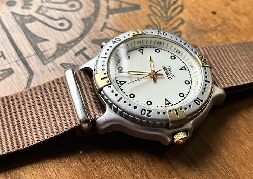 This brings me back to the subject of the fashion watch. I don’t want to go into all the different types of Timex watches at this time because I meant to stick to diver styles, but, there was an explosion of crazy diver/nautical looks and lots of gold appearing. Also, Timex was more concerned with incorporating Indiglo into its lines than focusing on the niche sport diver market.