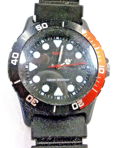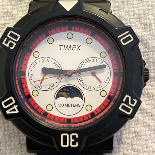 I had to show this above image of what a 31 yr-old Timex can look like! Compare this to the photo before and you can see most of the bezel printing has been scraped off and the original bracelet is gone. This is a good example of why when collecting old Timexes, condition is paramount. They were not meant to last or be repaired. Most of the ’80s and ’90s divers I have been mentioning in these posts are hard to find with original bracelets.