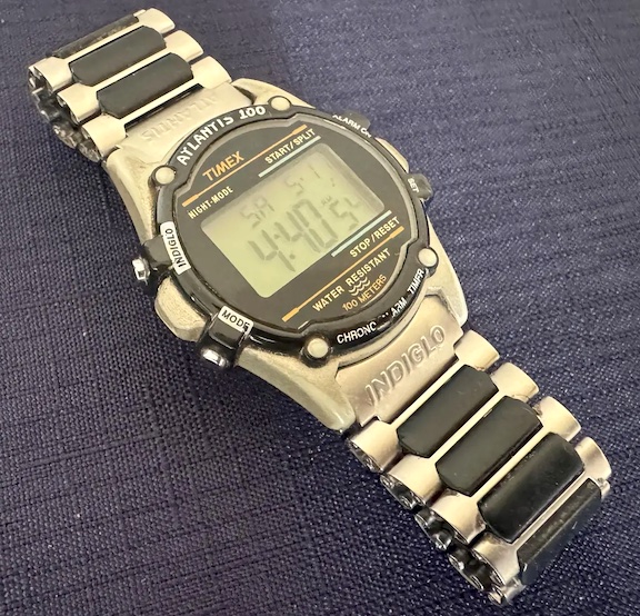 The above Atlantis shows a couple of details that makes me think it might be a 1993 version. It has the Indiglo word mark on the bracelet and has the metal and plastic bracelet style. Indiglo started appearing in ’93 and this type of bracelet started on the Ironman in ’90 but did not get to the Atlantis until ’92-93. They had the same jubilee type as the 00317 diver. I always liked the look of this type of bracelet. I wish Timex could continue it with better built version for their current watches.