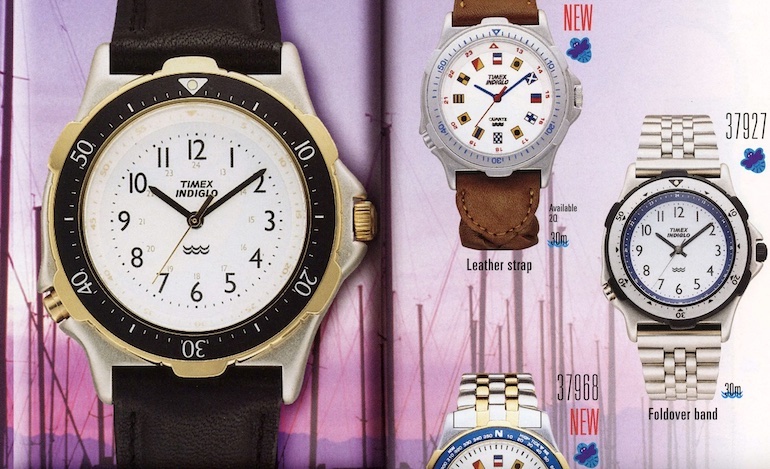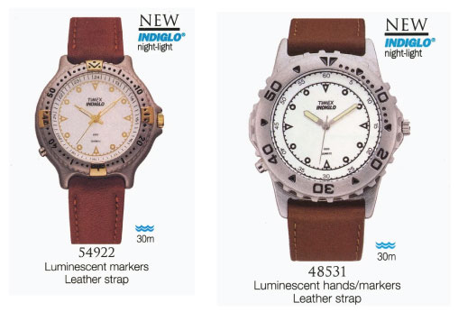 This is the point where my source, Heritage1854.com, starts to dry up with US market catalogs. They have a 1992 France and no 1993 yet. Then, the continue with some ’94 an ’95, which are great. As I have said with just about any watch brand (except Tag Heuer), its really hard to find old catalogs on line. But, a lot of stuff is happening about this time with Timex. The big thing is the release of the first Indigo back-lit watches that lights up the whole dial. I think they were released in 1992 for Christmas season. At first, most models had an additional push-button to light up the dial before the switch was incorporated into the crown action.
