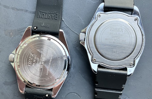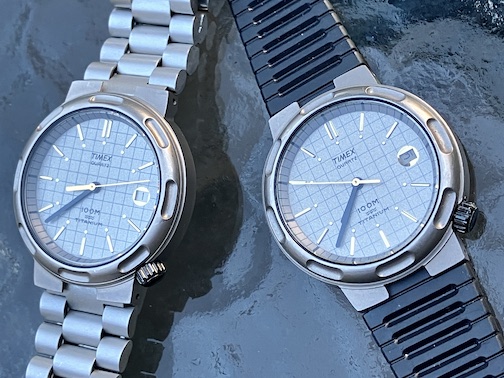 I’m not even sure what the new model number for the men’s is because I can’t find any info on it yet. The earlier version was the 31911. The changes really transformed the look and feel of the watch. Only the case is the same; the dial, hands, colors, strap are all different. The 24-hr numbers are gone. It went from sporty to more sophisticated. In the image above, the watch on left has the original bracelet while the one on the right has a replacement, non-Timex, rubber from the period.
