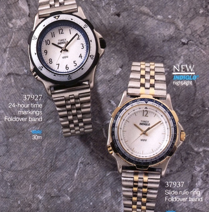 I took this slice of a ’95 catalog to briefly highlight the nautical theme many of the men’s and women’s were sporting. The bigger image of watch on left is the 37901, with dark bezel insert, which would be around for four years. The 37927 came out in ’94. The dials with the nautical signal flags spell out TIMEX INDIGLO! All are 30m WR watches.