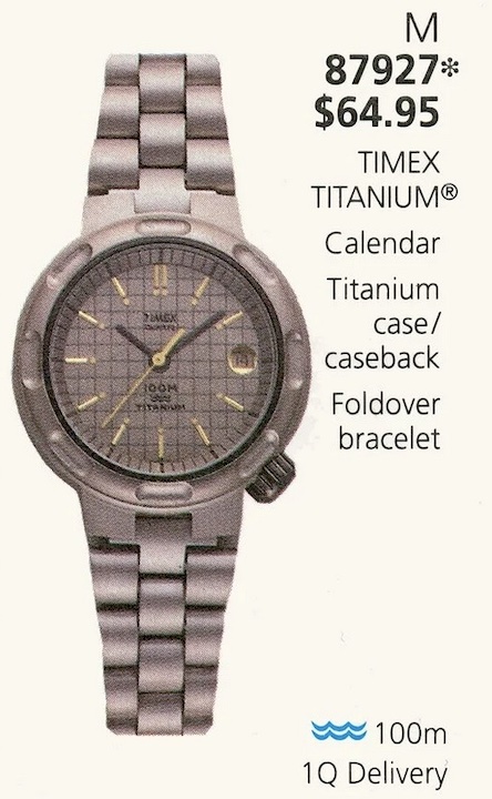 To follow up on the mention above about the men’s version of the titanium diver still showing the old look in this 1991 catalog; I have examples of the new look men’s gray/gilt with manufacture dates of 1988 and 1990. I suppose that reinforces how difficult it can be to date watches when catalogs can differ and production can start before catalogs are printed or models are announced. Anyway, its a cool little watch, and as I say, a candidate for reissue?